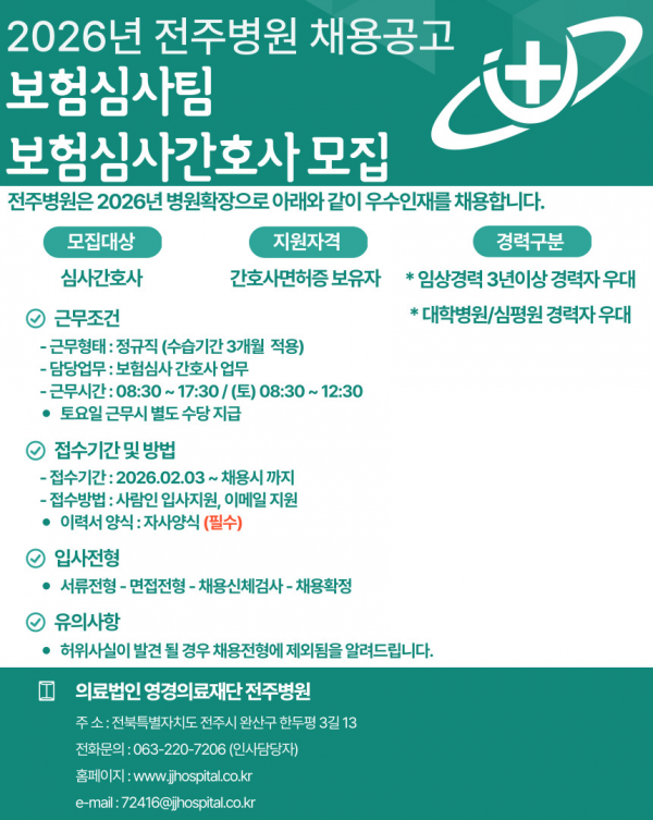 7. 접수방법 : 사람인 입사지원, 이메일 지원 *이력서 양식 : 자사양식(필수) - 전주병원 홈페이지 채용정보 입사지원서 양식 다운로드